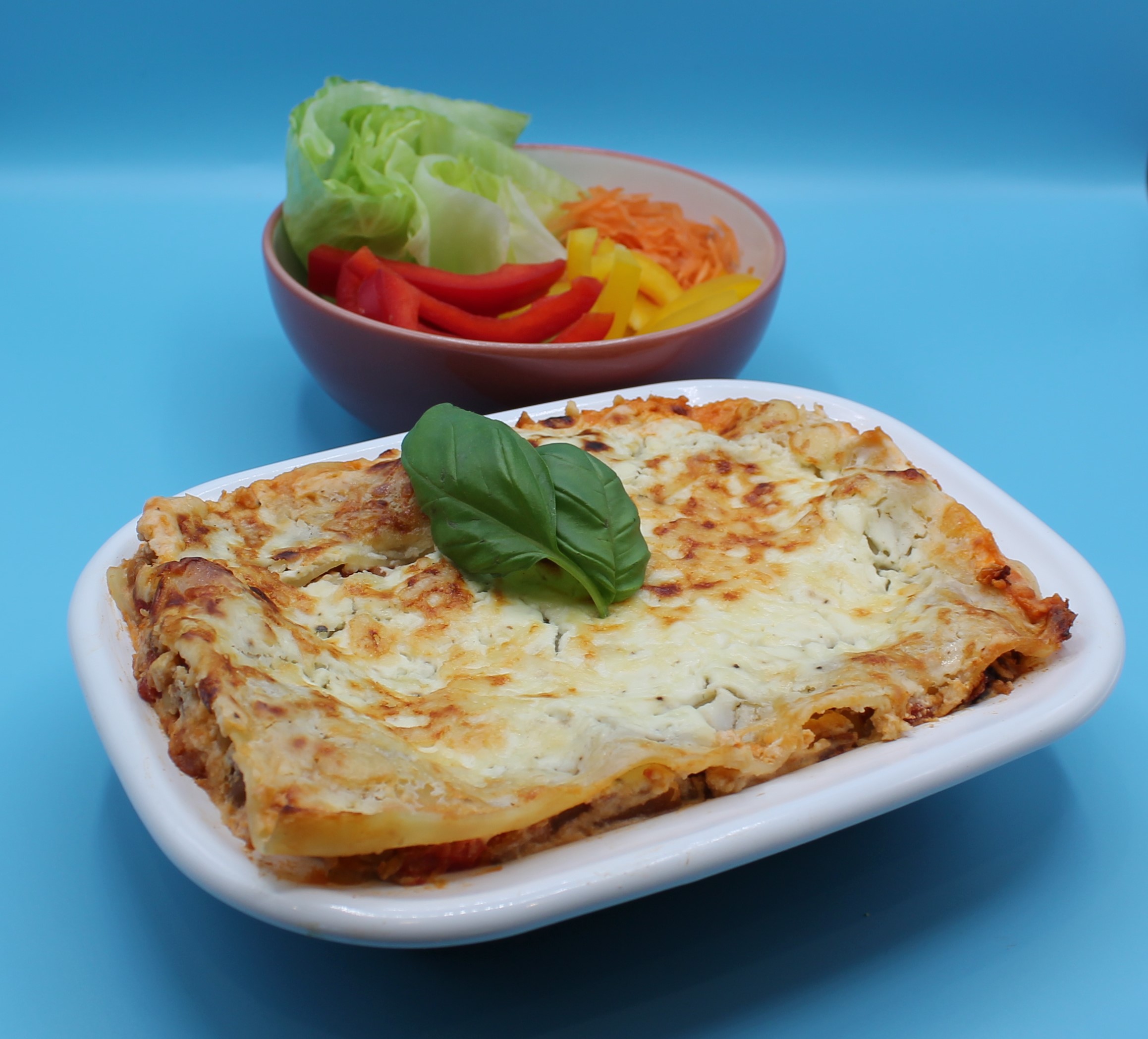 7. In an ovenproof dish or foil tray, spread some lentil mixture in the bottom, cover with lasagne sheets and a little crème fraiche sauce. Repeat this, finishing with the sauce on top.