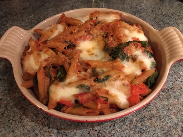 - When the pasta is cooked remove from the heat and stir in the spinach and allow to wilt.