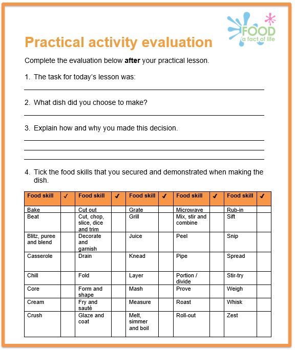 Another tip for using this evaluation is to consider laminating the template for younger year groups. They can then complete it at the end of a practical food lesson, or as an activity in another lesson after they have cooked.