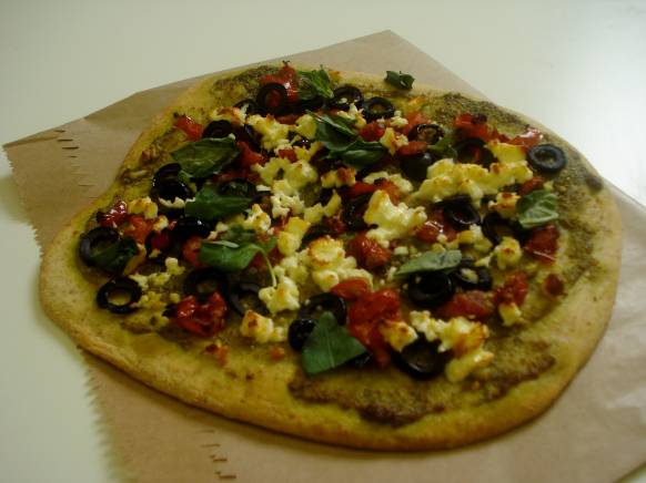- Spread the pesto on the base almost to the edge of the pizza with a palette knife.