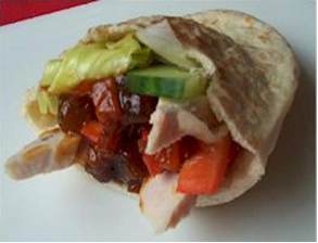 - Holding the pitta pocket in your hand, place a few strips of yellow pepper, cucumber slices and chicken strips on to the shredded lettuce.