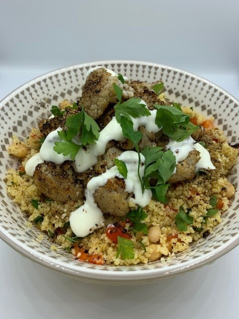 - Place the couscous in a serving dish and top with the roasted cauliflower.