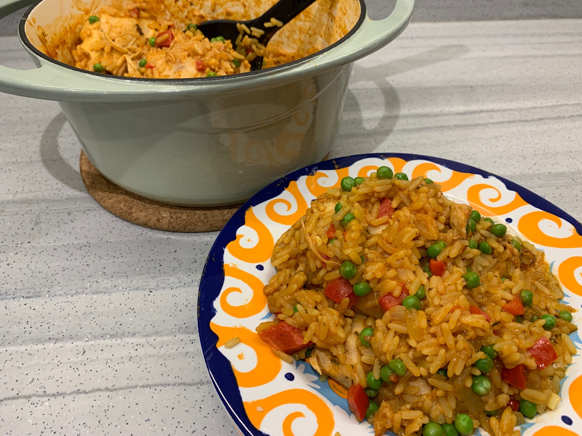 - Reduce the heat, cover with a lid and simmer for 20 minutes until the rice is tender and the chicken cooked. Stir occasionally to prevent the rice from sticking to the bottom of the pan. Add more boiling water if need be.