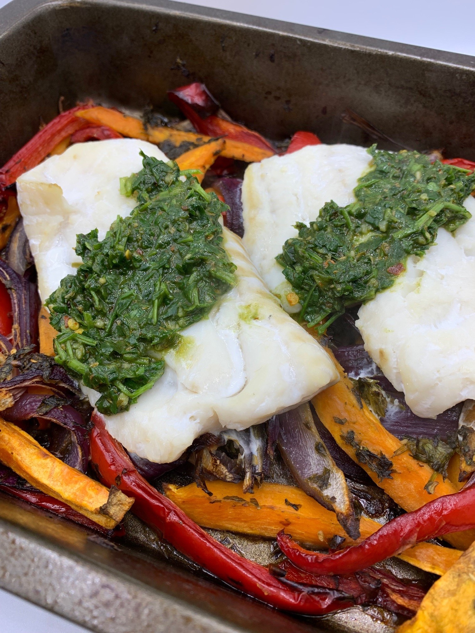 - Spoon over the roasted vegetables and fish to serve.
