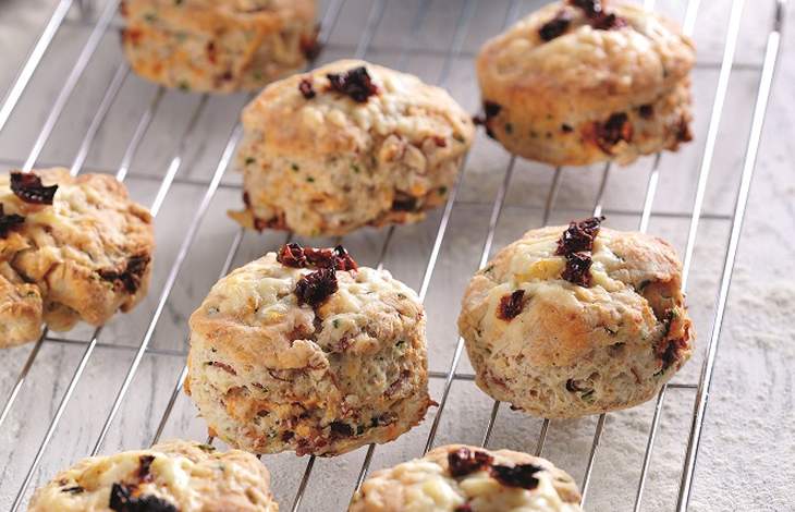 - Stir in the ham, half the cheese, all but 1 tbsp of tomatoes and the chives, then season. Mix in the milk to form a soft dough.
