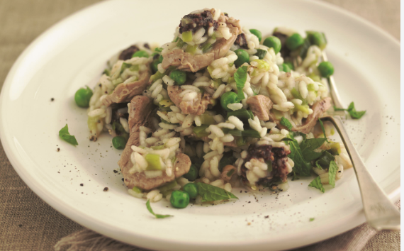 5. Add the rice and dried herbs, stir well and then add most of the stock. Keep a little stock in reserve to add later if necessary.
