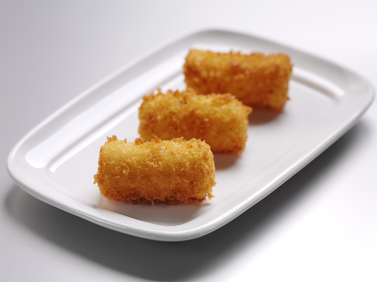4. Pass the potato shapes through flour, egg wash and breadcrumbs.