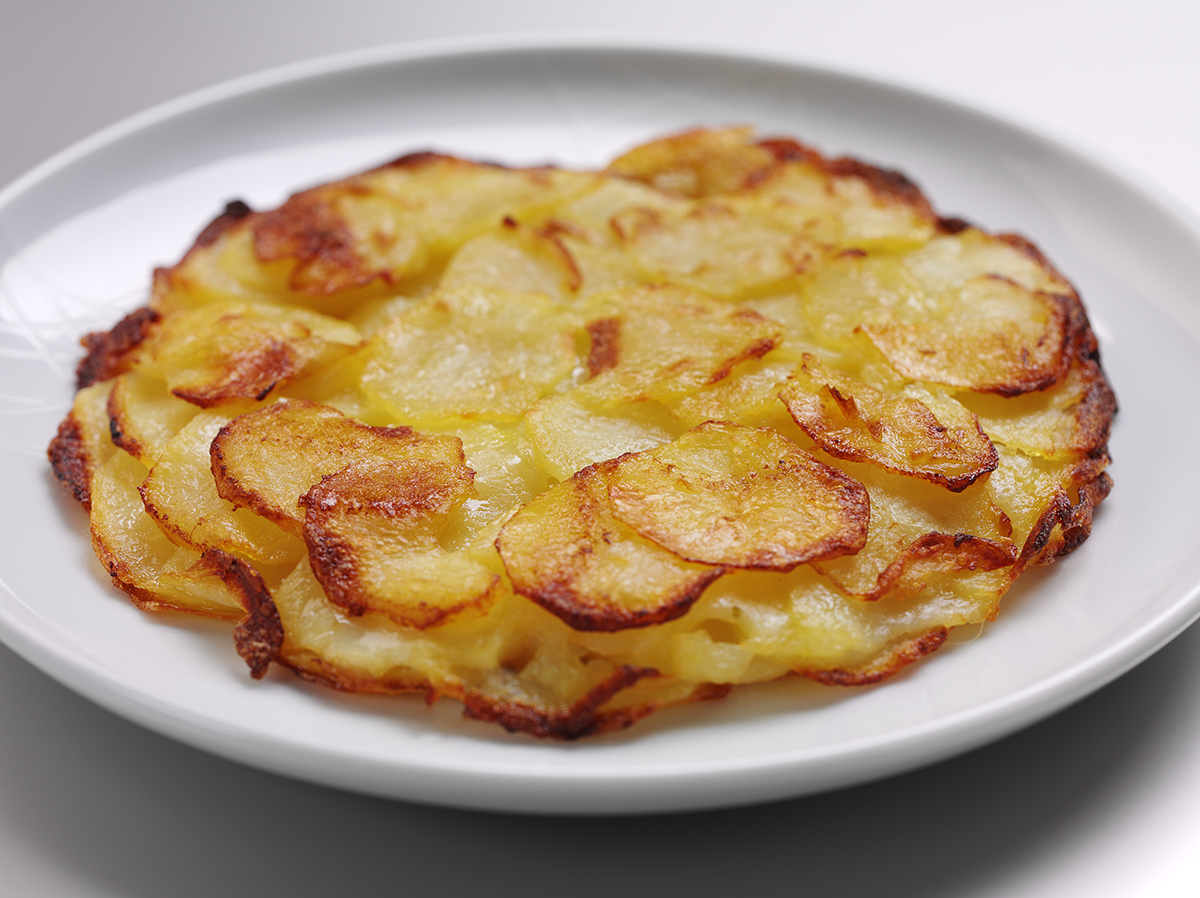 - Press down the potato slices 3 or 4 times during cooking to form a solid cake and reserve any excess butter.
