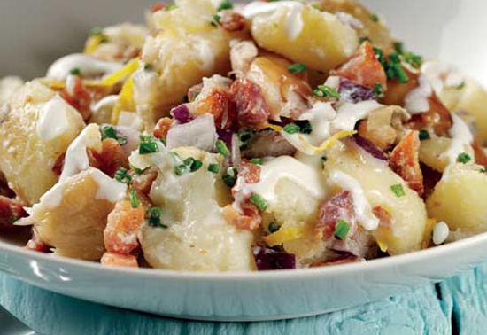 6. Add the smoked mackerel, horseradish dressing and pancetta to the potatoes.